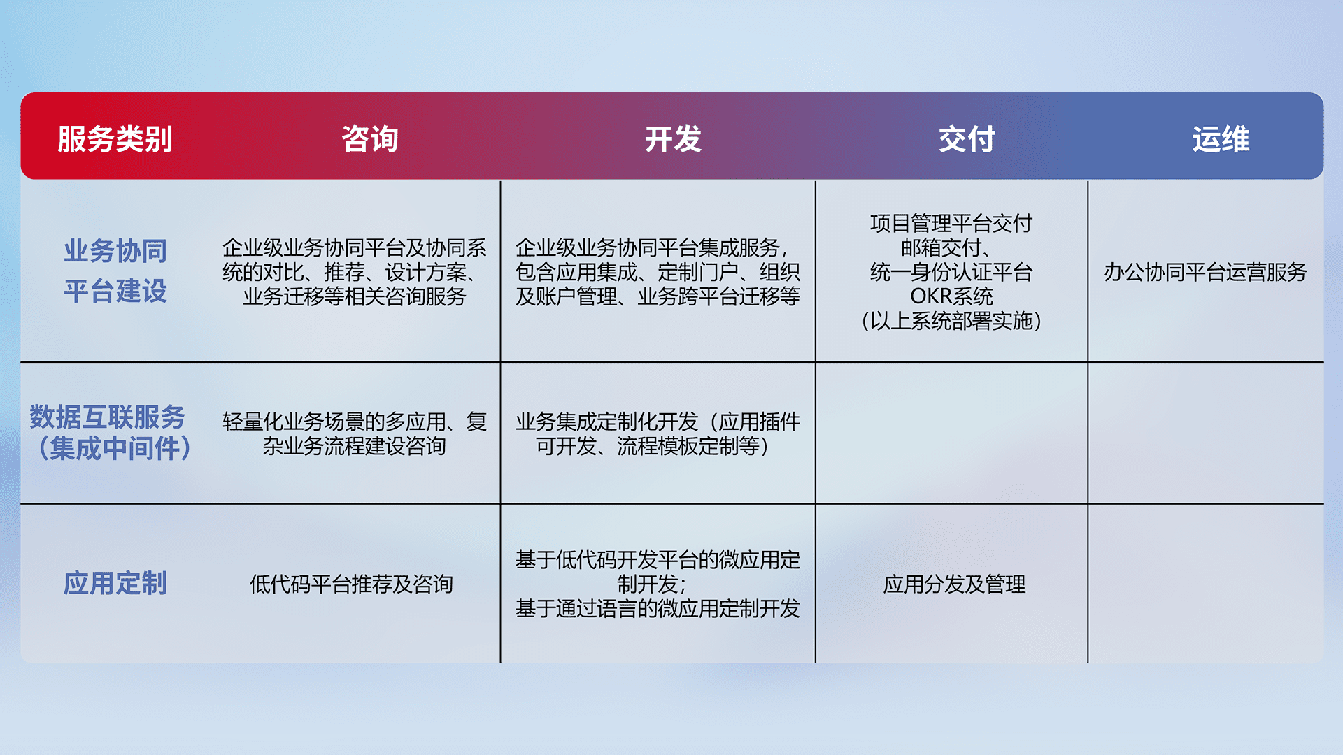 针对钉钉、、企微、、IDaas等平台级产品提供产品的规划、、、方案、、、、交付、、、、定制化开发等服务,,,实现如统一协同办公、、、、智能客户服务、、混合会议管理、、、智能数据查询、、等业务场景,,,实现数字化转型。。。。
